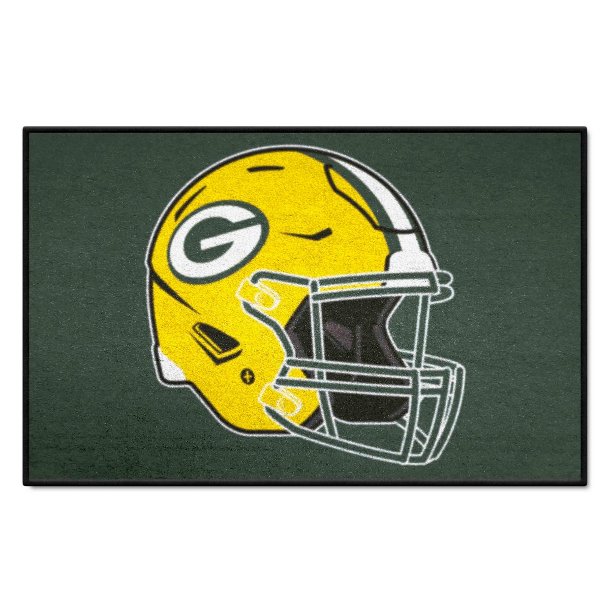 | Green Bay Packers Starter Mat Accent Rug - 19in. x 30in., Helmet Logo 9 Ounce, 100 % Nylon Face Recycled vinyl backing for a durable and longer-lasting product Machine made and tufted in the USA Non-skid backing with serged borders for added durability Machine washable; vacuum regularly and spot clean for any easy and quick clean Officially licensed and chromojet-printed in true team colors for vibrant, lasting color NFL - Green Bay Packers in Wisconsin NFL National Football League |
