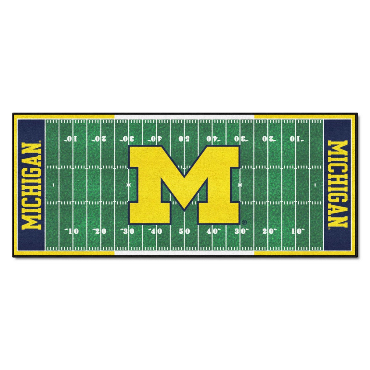 | Michigan Wolverines Field Runner Mat - 30in. x 72in. 9 Ounce, 100 % Nylon Face Recycled vinyl backing for a durable and longer-lasting product Machine made and tufted in the USA Non-skid backing with serged borders for added durability Machine washable; vacuum regularly and spot clean for any easy and quick clean Officially licensed and chromojet-printed in true team colors for vibrant, lasting color University of Michigan in Michigan |