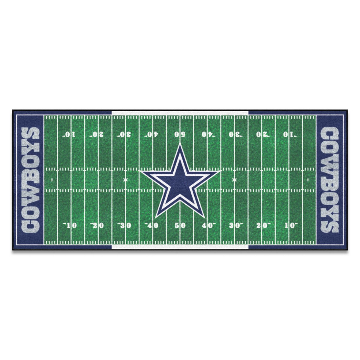 | Dallas Cowboys Field Runner Mat - 30in. x 72in. 9 Ounce, 100 % Nylon Face Recycled vinyl backing for a durable and longer-lasting product Machine made and tufted in the USA Non-skid backing with serged borders for added durability Machine washable; vacuum regularly and spot clean for any easy and quick clean Officially licensed and chromojet-printed in true team colors for vibrant, lasting color NFL - Dallas Cowboys in Texas NFL National Football League |