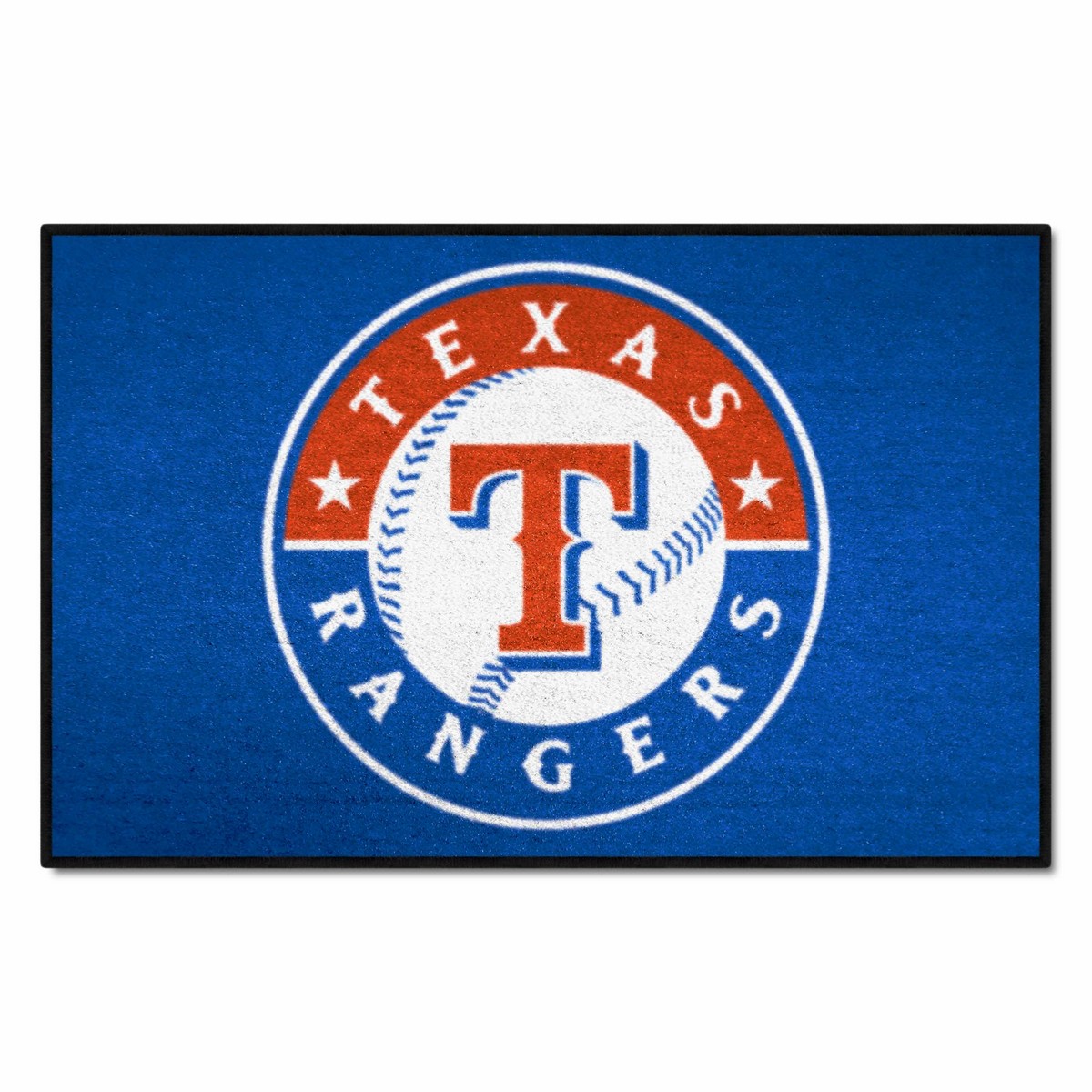 | Texas Rangers Starter Mat Accent Rug - 19in. x 30in. 9 Ounce, 100 % Nylon Face Recycled vinyl backing for a durable and longer-lasting product Machine made and tufted in the USA Non-skid backing with serged borders for added durability Machine washable; vacuum regularly and spot clean for any easy and quick clean Officially licensed and chromojet-printed in true team colors for vibrant, lasting color MLB - Texas Rangers in Texas MLB Major League Baseball |