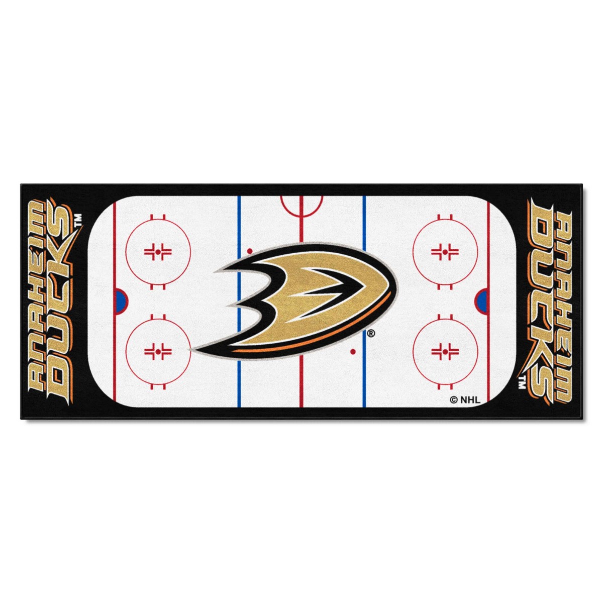 | Anaheim Ducks Rink Runner - 30in. x 72in. 9 Ounce, 100 % Nylon Face Recycled vinyl backing for a durable and longer-lasting product Machine made and tufted in the USA Non-skid backing with serged borders for added durability Machine washable; vacuum regularly and spot clean for any easy and quick clean Officially licensed and chromojet-printed in true team colors for vibrant, lasting color NHL - Anaheim Ducks in California NHL National Hockey League |