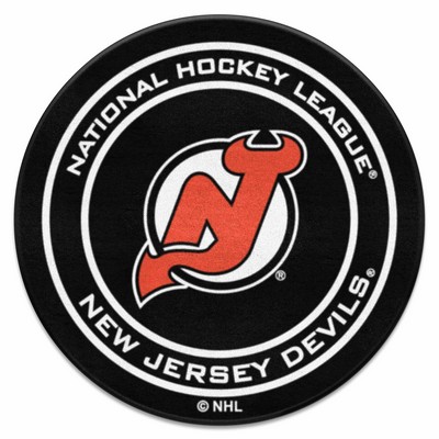 | New Jersey Devils Hockey Puck Rug - 27in. Diameter 9 Ounce, 100 % Nylon Face Recycled vinyl backing for a durable and longer-lasting product Machine made and tufted in the USA Non-skid backing with taped borders for added durability Machine washable; vacuum regularly and spot clean for any easy and quick clean Officially licensed and chromojet-printed in true team colors for vibrant, lasting color NHL - New Jersey Devils in New Jersey NHL National Hockey League |