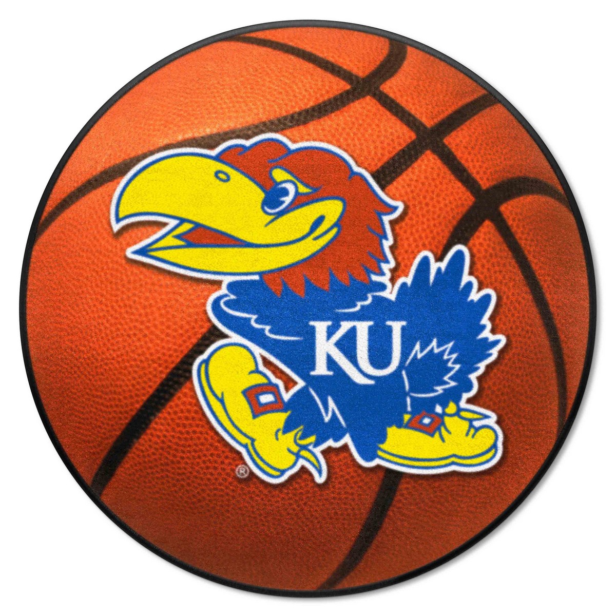 | Kansas Jayhawks Basketball Rug - 27in. Diameter 9 Ounce, 100 % Nylon Face Recycled vinyl backing for a durable and longer-lasting product Machine made and tufted in the USA Non-skid backing with taped borders for added durability Machine washable; vacuum regularly and spot clean for any easy and quick clean Officially licensed and chromojet-printed in true team colors for vibrant, lasting color University of Kansas in Kansas |