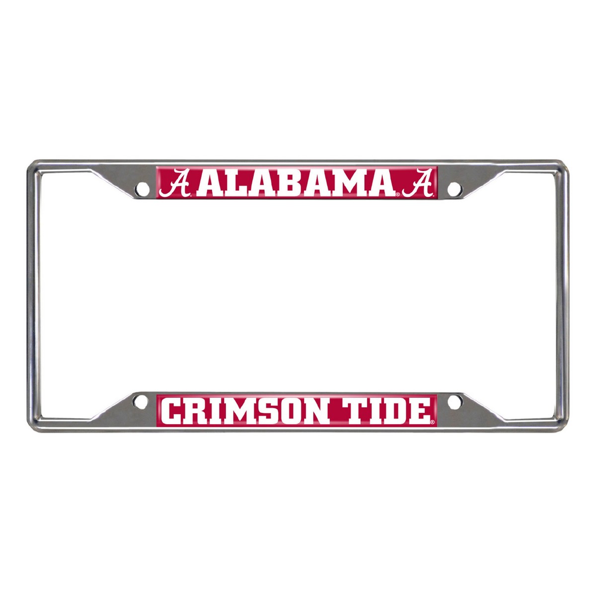 | Alabama Crimson Tide Chrome Metal License Plate Frame, 6.25in x 12.25in Made of chrome metal with a durable finish that resists the elements Team logo is domed and features vibrant colors that catch the eye 4 pre-drilled holes ensure a safe and secure fit, plus no rattling noises while driving Slimline design helps keep registration tag visible Fits most standard plates, measures 6.25" x 12.25" Screws not included University of Alabama in Alabama |