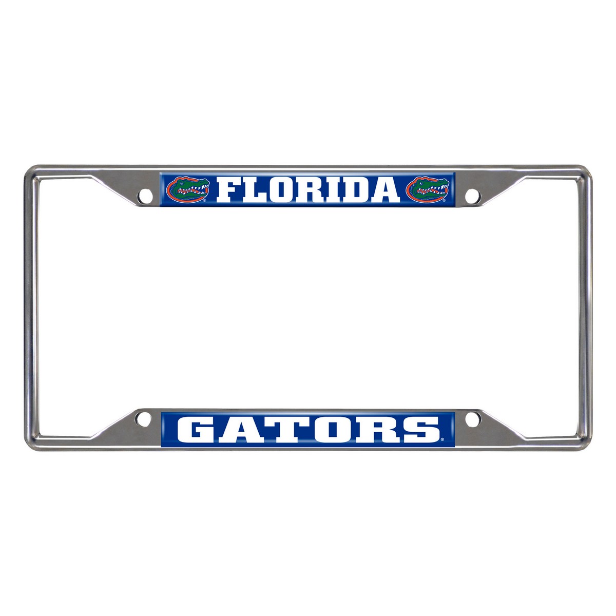 | Florida Gators Chrome Metal License Plate Frame, 6.25in x 12.25in Made of chrome metal with a durable finish that resists the elements Team logo is domed and features vibrant colors that catch the eye 4 pre-drilled holes ensure a safe and secure fit, plus no rattling noises while driving Slimline design helps keep registration tag visible Fits most standard plates, measures 6.25" x 12.25" Screws not included University of Florida in Florida |
