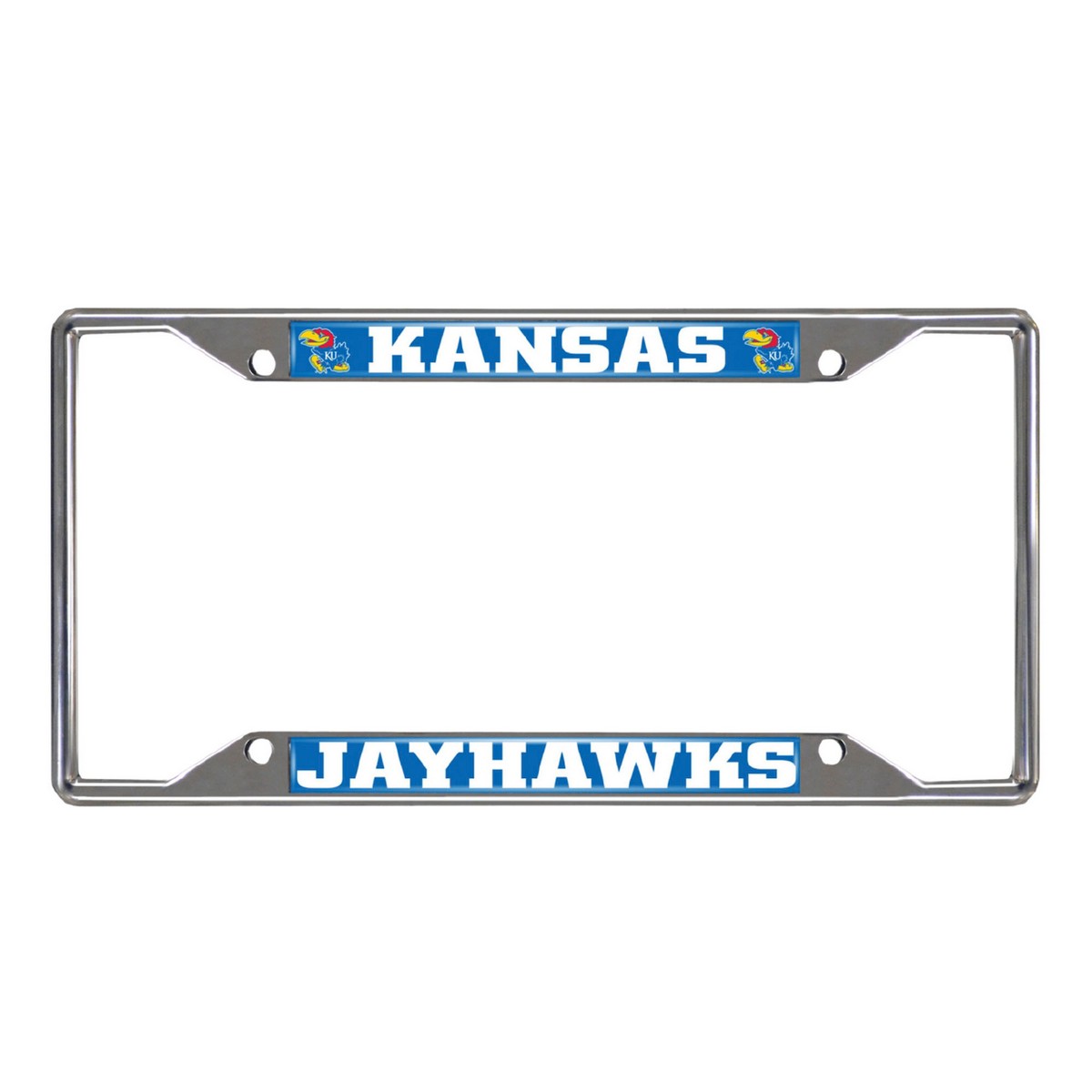 | Kansas Jayhawks Chrome Metal License Plate Frame, 6.25in x 12.25in Made of chrome metal with a durable finish that resists the elements Team logo is domed and features vibrant colors that catch the eye 4 pre-drilled holes ensure a safe and secure fit, plus no rattling noises while driving Slimline design helps keep registration tag visible Fits most standard plates, measures 6.25" x 12.25" Screws not included University of Kansas in Kansas |