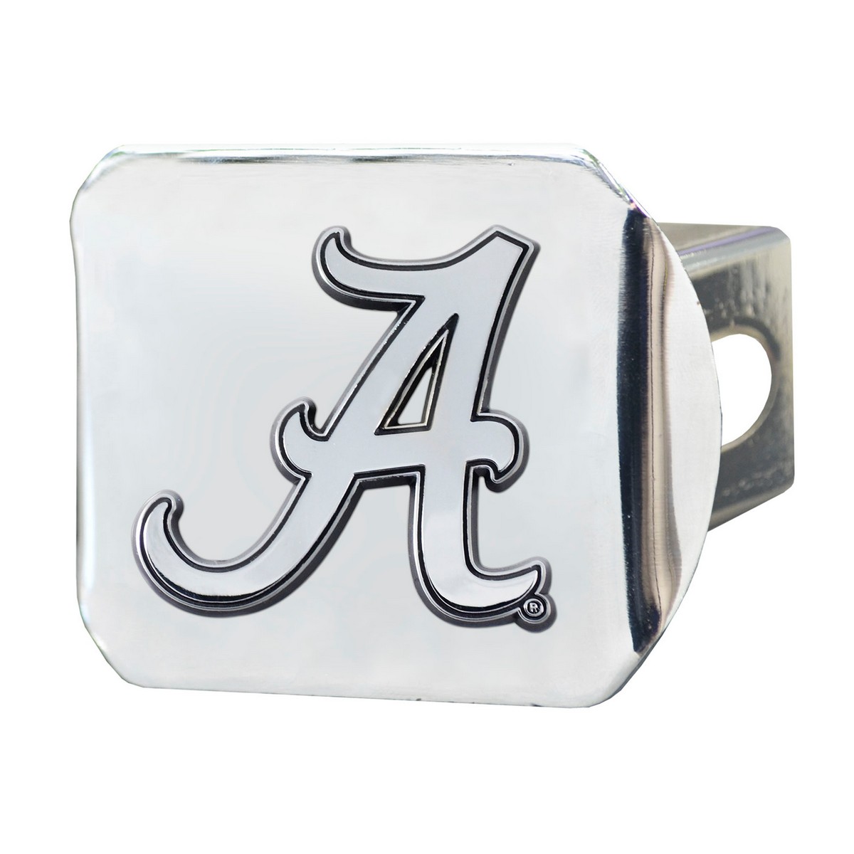 | Alabama Crimson Tide Chrome Metal Hitch Cover with Chrome Metal 3D Emblem, A Logo Completely wraps your hitch to keep all debris out Fits all 2 in. Class III hitches for a secure installation Made of chromed metal for a sleek design 3-D molded design to clearly outline the team logo Attaches without use of tools for an easy on and off; pin is not included Keeps your hitch clear of debris University of Alabama in Alabama |