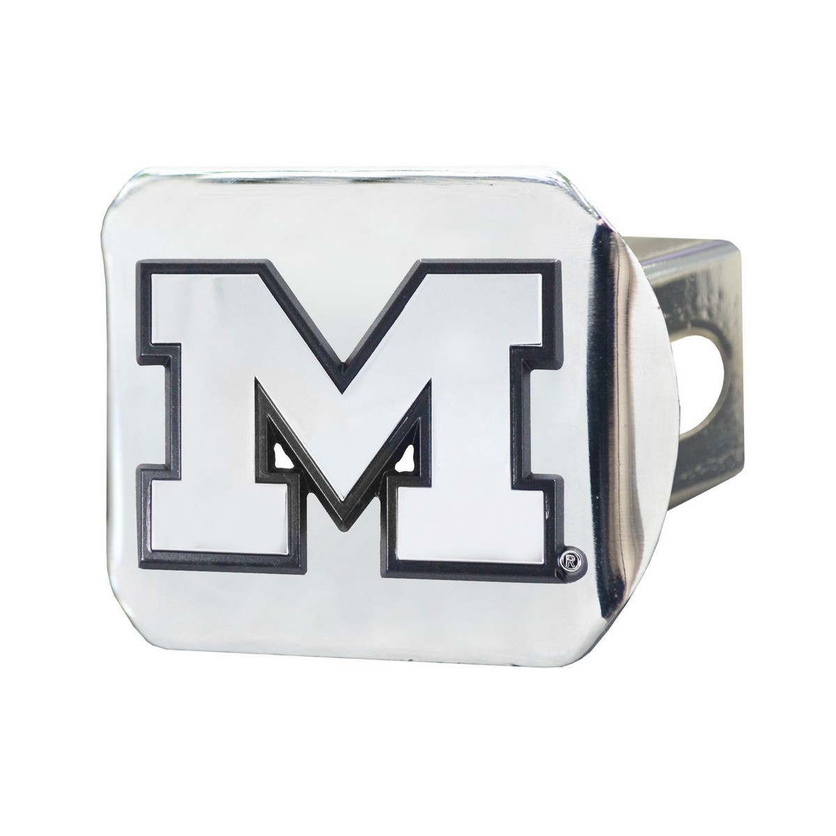 | Michigan Wolverines Chrome Metal Hitch Cover with Chrome Metal 3D Emblem Completely wraps your hitch to keep all debris out Fits all 2 in. Class III hitches for a secure installation Made of chromed metal for a sleek design 3-D molded design to clearly outline the team logo Attaches without use of tools for an easy on and off; pin is not included Keeps your hitch clear of debris University of Michigan in Michigan |