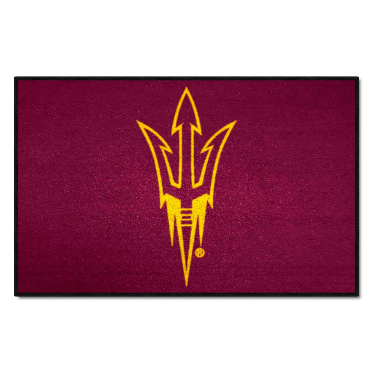 | Arizona State Sun Devils Starter Mat Accent Rug - 19in. x 30in., Pitchfork Logo 9 Ounce, 100 % Nylon Face Recycled vinyl backing for a durable and longer-lasting product Machine made and tufted in the USA Non-skid backing with serged borders for added durability Machine washable; vacuum regularly and spot clean for any easy and quick clean Officially licensed and chromojet-printed in true team colors for vibrant, lasting color Arizona State University in Arizona |