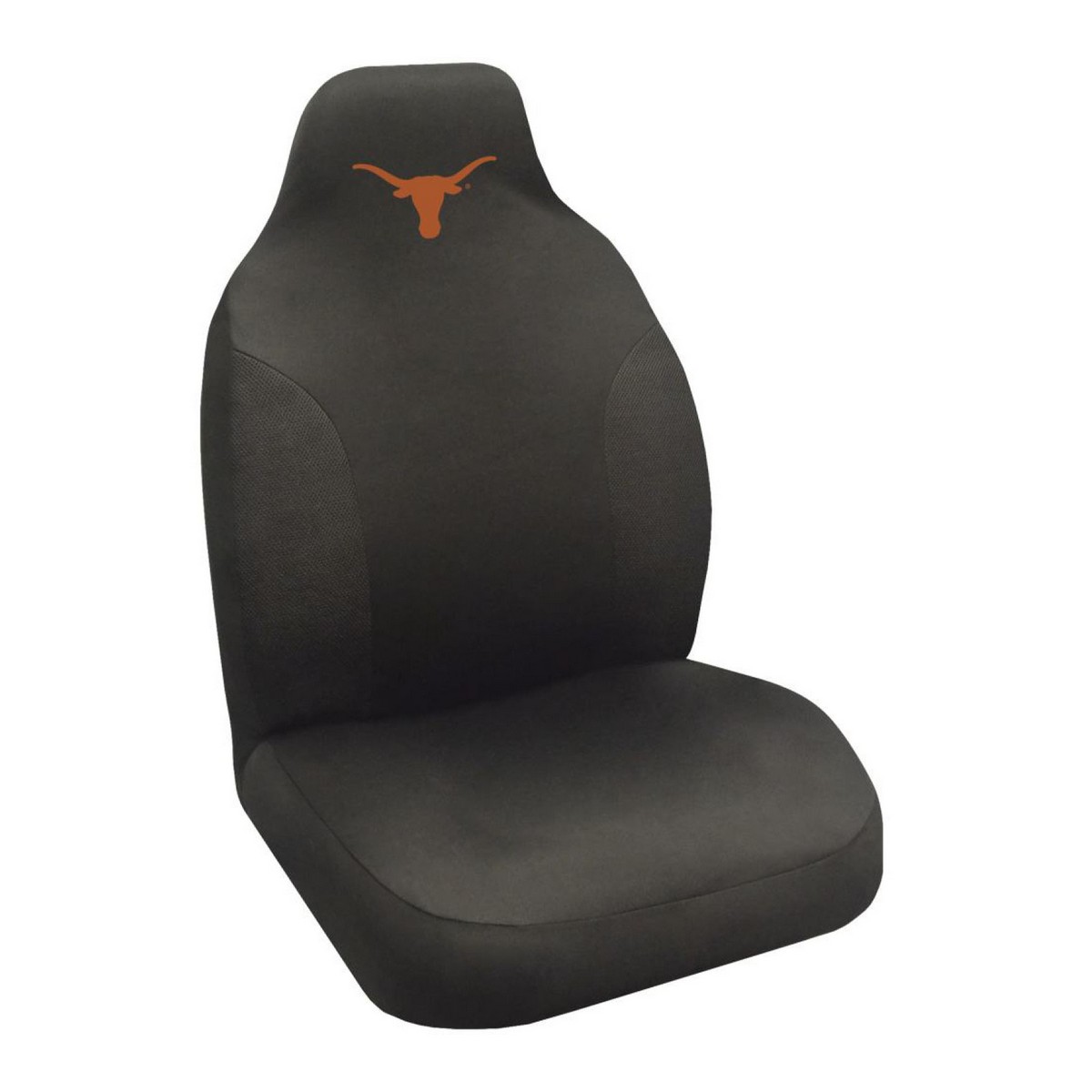 | Texas Longhorns Embroidered Seat Cover Made of soft stretchy material and features soft mesh side panels for breathability and style Material and under-seat hooks ensure a nice snug fit Team logo is embroidered on the front; will not peel or fade Sold individually Attaches without use of tools for an easy on and off Compatible with most vehicles University of Texas in Texas |