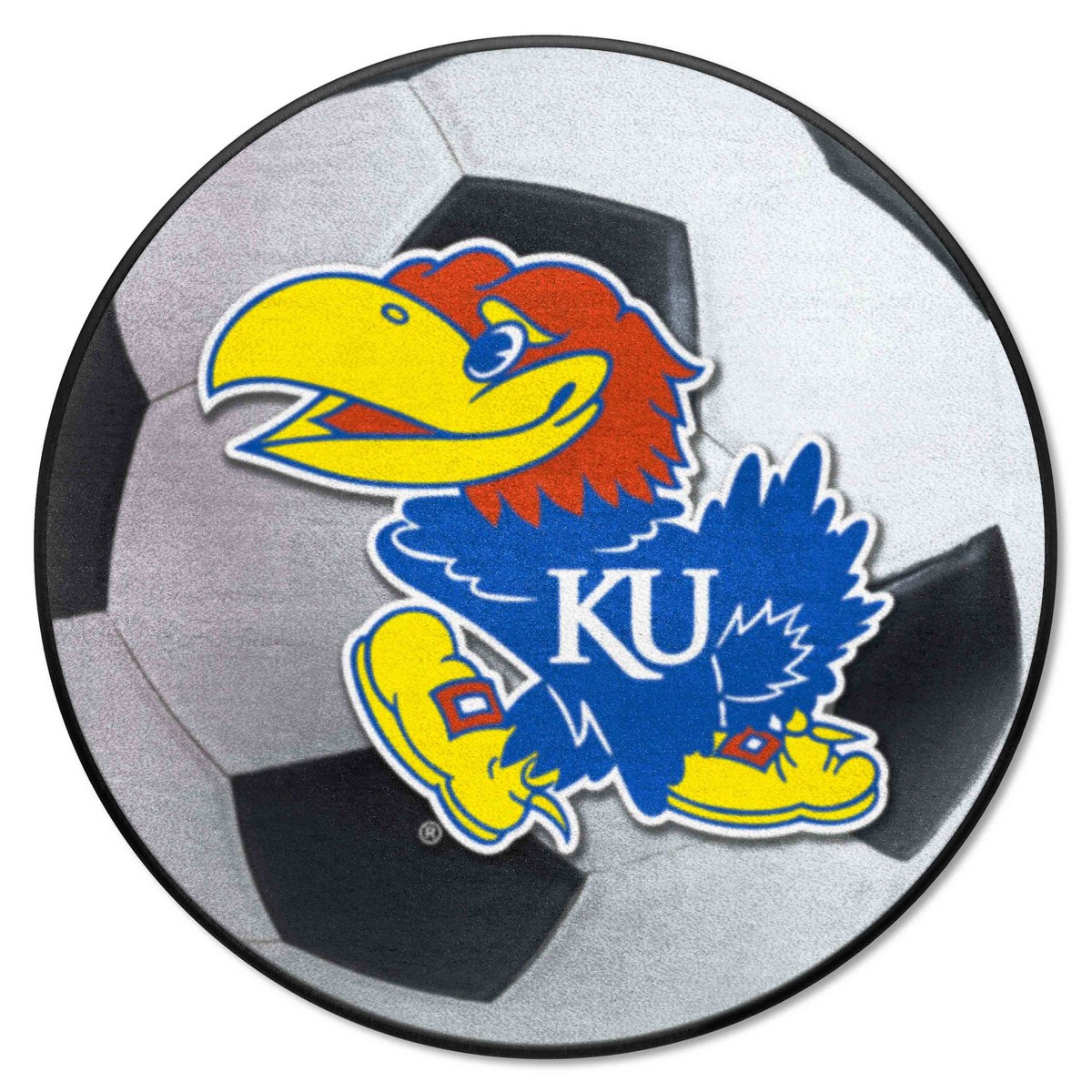 | Kansas Jayhawks Soccer Ball Rug - 27in. Diameter 9 Ounce, 100 % Nylon Face Recycled vinyl backing for a durable and longer-lasting product Machine made and tufted in the USA Non-skid backing with taped borders for added durability Machine washable; vacuum regularly and spot clean for any easy and quick clean Officially licensed and chromojet-printed in true team colors for vibrant, lasting color University of Kansas in Kansas |
