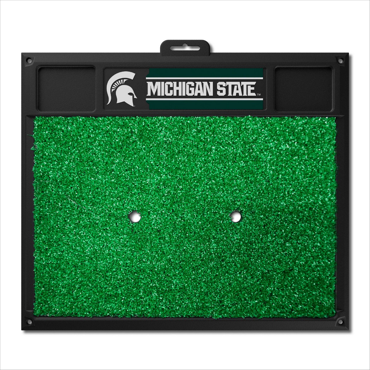 | Michigan State Spartans Golf Hitting Mat Dual tee design for left and right handed golfers Removable tee also accepts wooden tees Stays in place; anchor mat down in all four corners with tees Cups to hold your balls and tees Made of heavy duty vinyl and has a realistic turf Saves your lawn from divots Michigan State University in Michigan |