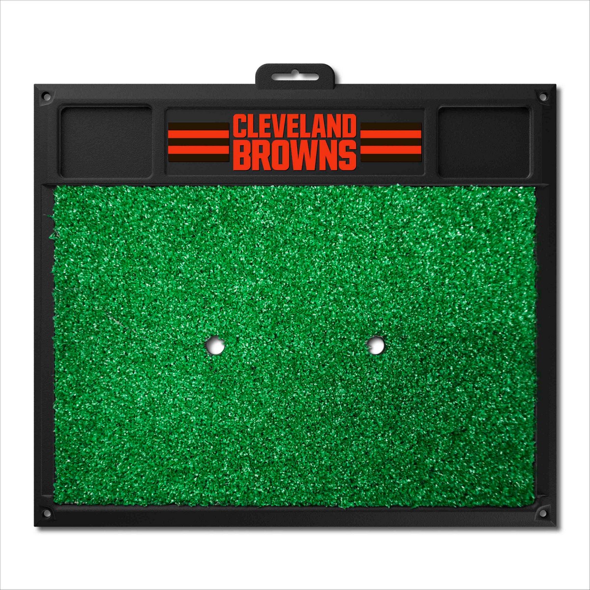 | Cleveland Browns Golf Hitting Mat Dual tee design for left and right handed golfers Removable tee also accepts wooden tees Stays in place; anchor mat down in all four corners with tees Cups to hold your balls and tees Made of heavy duty vinyl and has a realistic turf Saves your lawn from divots NFL - Cleveland Browns in Ohio NFL National Football League |