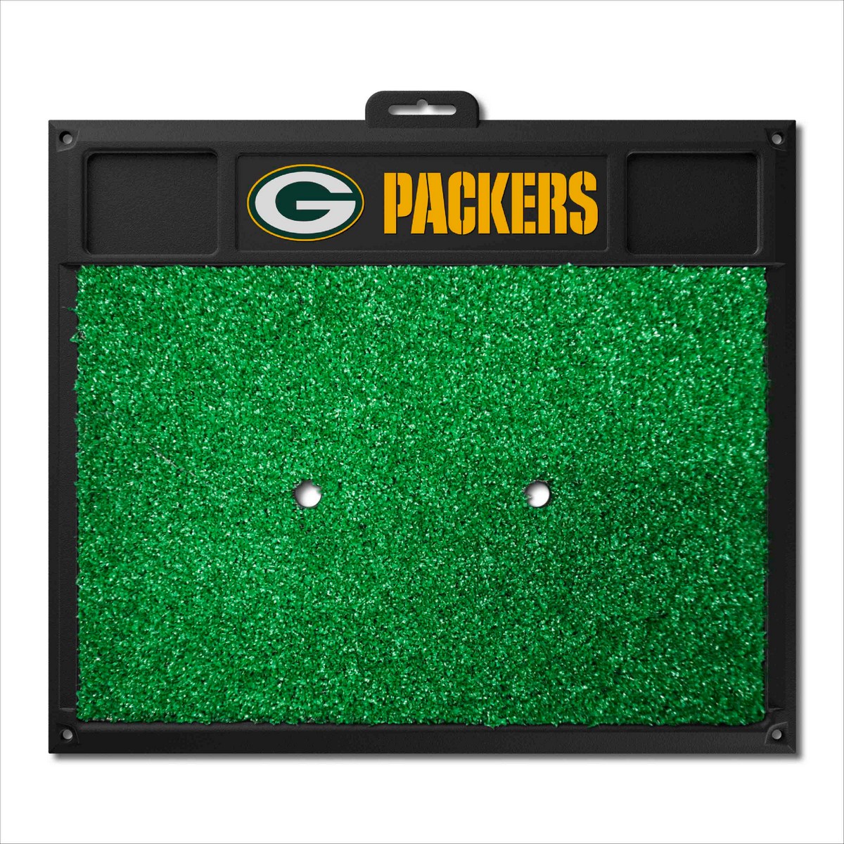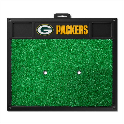 | Green Bay Packers Golf Hitting Mat Dual tee design for left and right handed golfers Removable tee also accepts wooden tees Stays in place; anchor mat down in all four corners with tees Cups to hold your balls and tees Made of heavy duty vinyl and has a realistic turf Saves your lawn from divots NFL - Green Bay Packers in Wisconsin NFL National Football League |