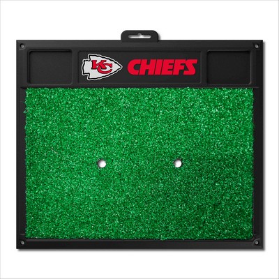 | Kansas City Chiefs Golf Hitting Mat Dual tee design for left and right handed golfers Removable tee also accepts wooden tees Stays in place; anchor mat down in all four corners with tees Cups to hold your balls and tees Made of heavy duty vinyl and has a realistic turf Saves your lawn from divots NFL - Kansas City Chiefs in Missouri NFL National Football League |