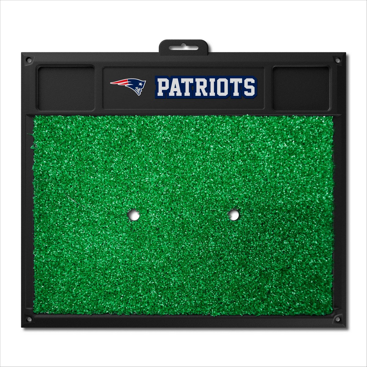 | New England Patriots Golf Hitting Mat Dual tee design for left and right handed golfers Removable tee also accepts wooden tees Stays in place; anchor mat down in all four corners with tees Cups to hold your balls and tees Made of heavy duty vinyl and has a realistic turf Saves your lawn from divots NFL - New England Patriots in Massachusetts NFL National Football League |