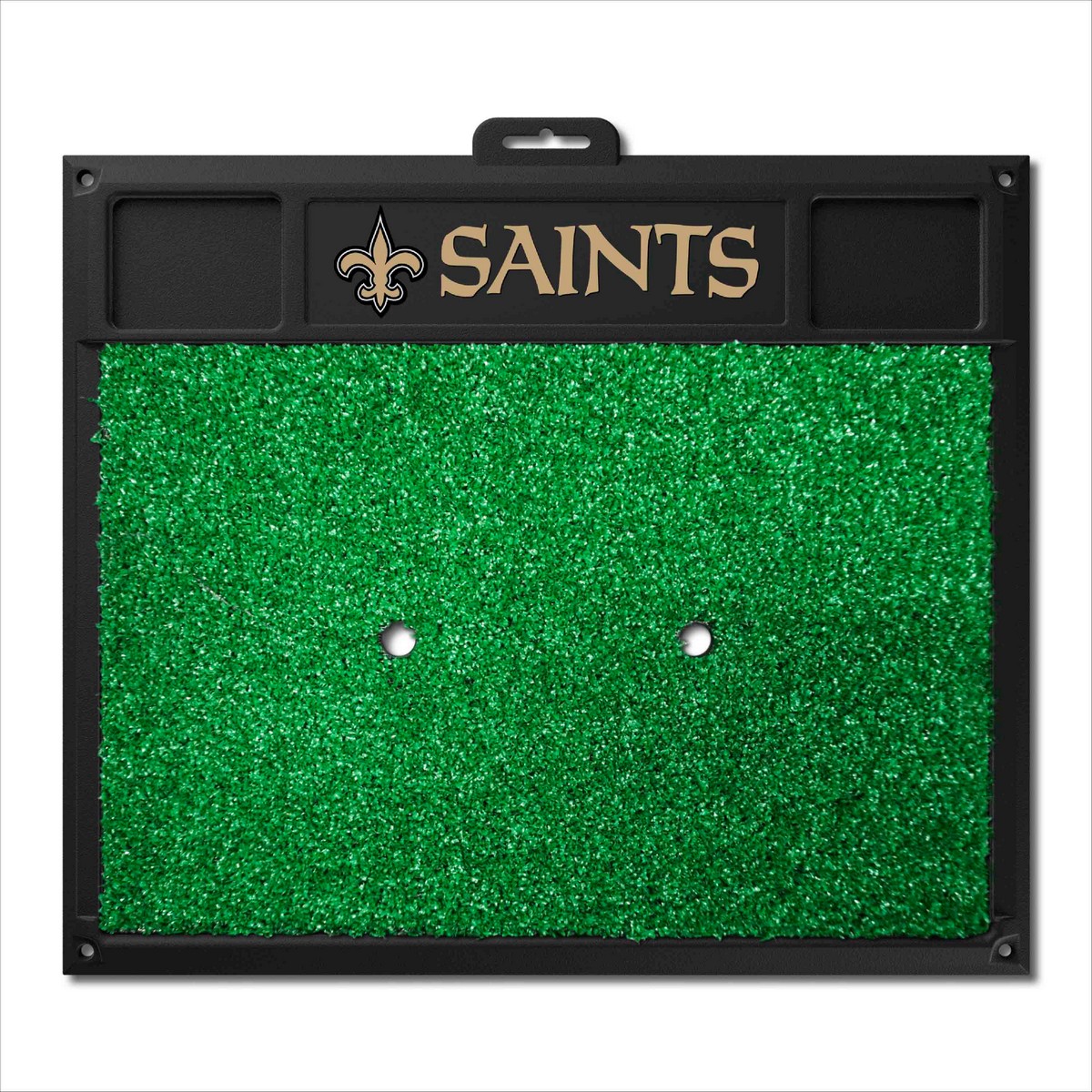 | New Orleans Saints Golf Hitting Mat Dual tee design for left and right handed golfers Removable tee also accepts wooden tees Stays in place; anchor mat down in all four corners with tees Cups to hold your balls and tees Made of heavy duty vinyl and has a realistic turf Saves your lawn from divots NFL - New Orleans Saints in Louisiana NFL National Football League |