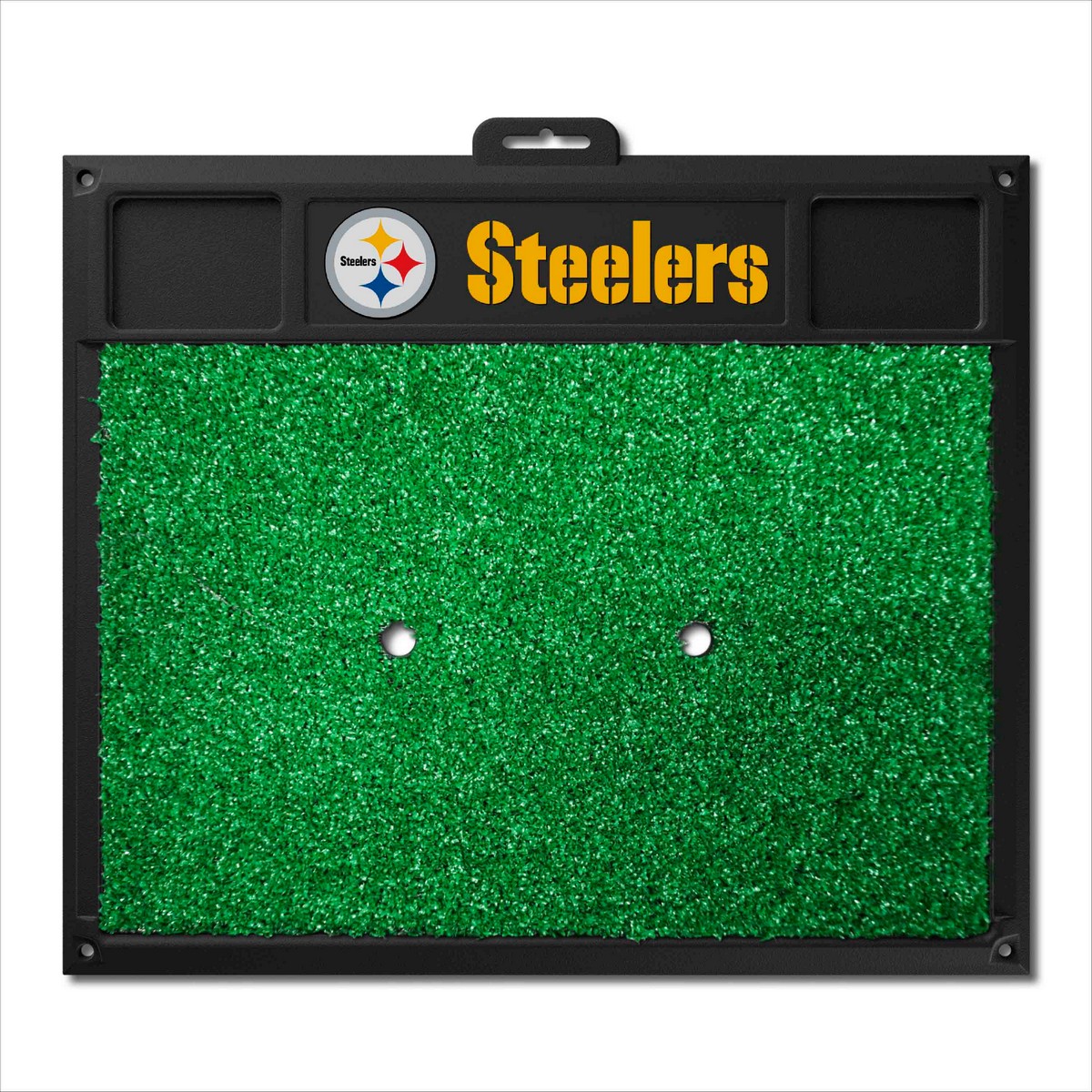| Pittsburgh Steelers Golf Hitting Mat Dual tee design for left and right handed golfers Removable tee also accepts wooden tees Stays in place; anchor mat down in all four corners with tees Cups to hold your balls and tees Made of heavy duty vinyl and has a realistic turf Saves your lawn from divots NFL - Pittsburgh Steelers in Pennsylvania NFL National Football League |