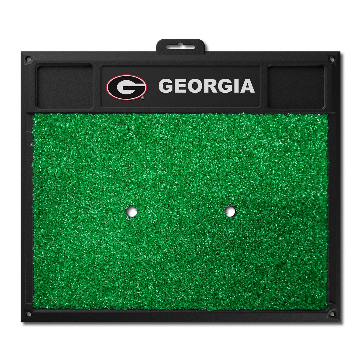 | Georgia Bulldogs Golf Hitting Mat Dual tee design for left and right handed golfers Removable tee also accepts wooden tees Stays in place; anchor mat down in all four corners with tees Cups to hold your balls and tees Made of heavy duty vinyl and has a realistic turf Saves your lawn from divots University of Georgia in Georgia |