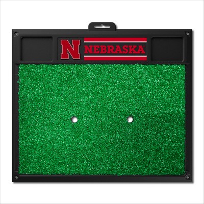 | Nebraska Cornhuskers Golf Hitting Mat Dual tee design for left and right handed golfers Removable tee also accepts wooden tees Stays in place; anchor mat down in all four corners with tees Cups to hold your balls and tees Made of heavy duty vinyl and has a realistic turf Saves your lawn from divots University of Nebraska in Nebraska |