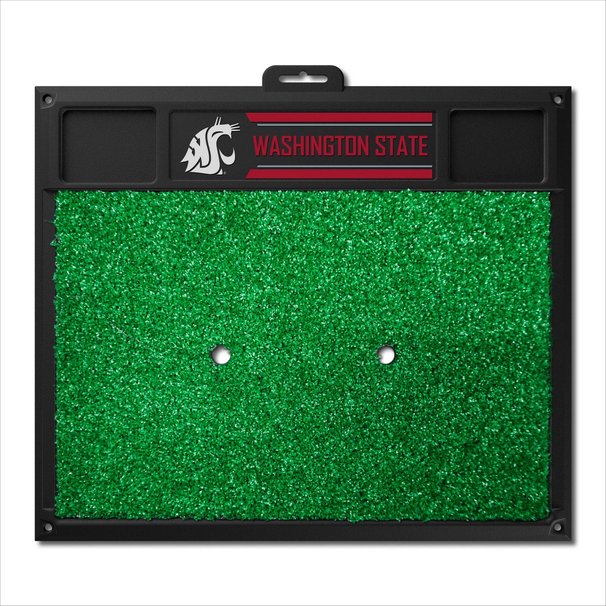 | Washington State Cougars Golf Hitting Mat Dual tee design for left and right handed golfers Removable tee also accepts wooden tees Stays in place; anchor mat down in all four corners with tees Cups to hold your balls and tees Made of heavy duty vinyl and has a realistic turf Saves your lawn from divots Washington State University in Washington |
