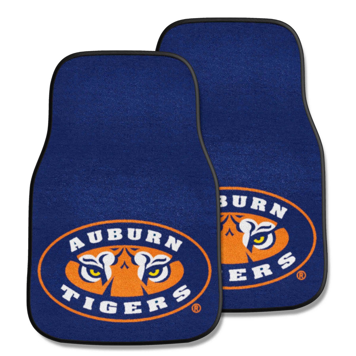 | Auburn Tigers Front Carpet Car Mat Set - 2 Pieces, Tiger Universal size to fit all vehicle types 100% Nylon face that is chromojet-printed for true team colors Taped edges and vinyl backing add durability and longer life Nibbed backing to keep from skidding Made in the USA Machine washable for easy cleaning; do not put in dryer Auburn University in Alabama |