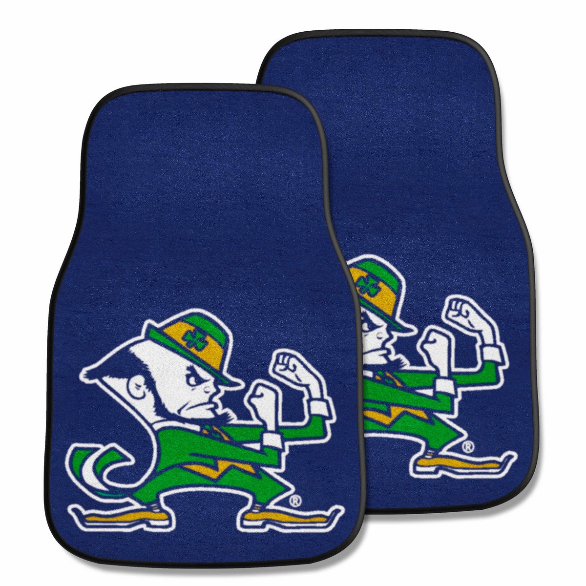 | Notre Dame Fighting Irish Front Carpet Car Mat Set - 2 Pieces, Leprechaun Universal size to fit all vehicle types 100% Nylon face that is chromojet-printed for true team colors Taped edges and vinyl backing add durability and longer life Nibbed backing to keep from skidding Made in the USA Machine washable for easy cleaning; do not put in dryer Notre Dame in Indiana |