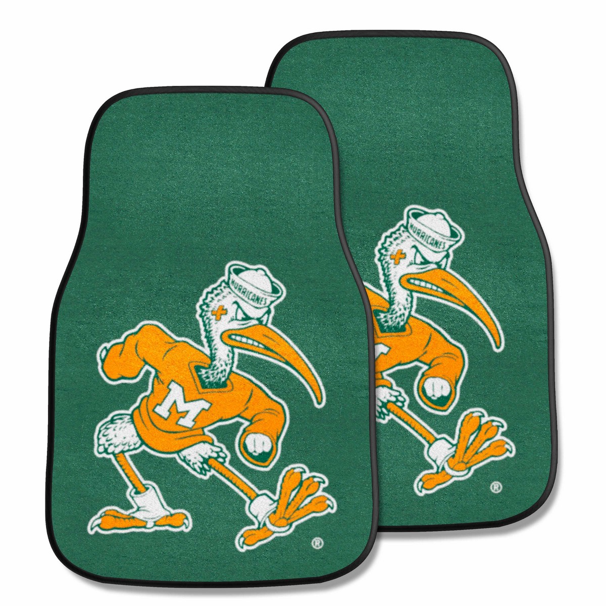 | Miami Hurricanes Front Carpet Car Mat Set - 2 Pieces, Sebastian the Ibis Universal size to fit all vehicle types 100% Nylon face that is chromojet-printed for true team colors Taped edges and vinyl backing add durability and longer life Nibbed backing to keep from skidding Made in the USA Machine washable for easy cleaning; do not put in dryer University of Miami in Florida |