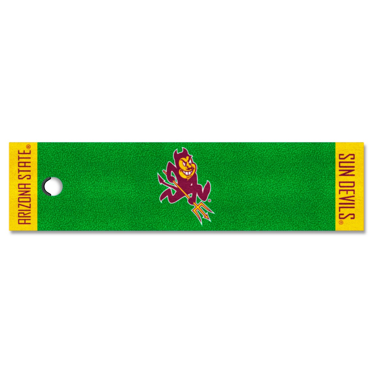| Arizona State Sun Devils Putting Green Mat - 1.5ft. x 6ft., Sparky Logo Realistic putting surface (11* on golf Stimpmeter) Includes putting target barrier/backstop Durable vinyl backing keeps mat in place 100% Nylon Face Doubles as a runner when not in use Officially licensed and chromojet printed in true team colors Arizona State University in Arizona |