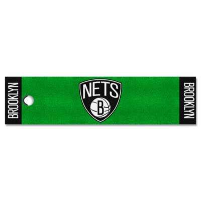 | Brooklyn Nets Putting Green Mat - 1.5ft. x 6ft. Realistic putting surface (11* on golf Stimpmeter) Includes putting target barrier/backstop Durable vinyl backing keeps mat in place 100% Nylon Face Doubles as a runner when not in use Officially licensed and chromojet printed in true team colors NBA - Brooklyn Nets in New York NBA National Basketball Association |