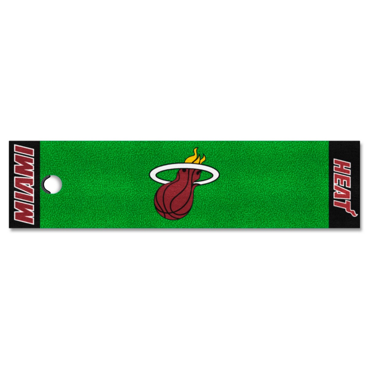 | Miami Heat Putting Green Mat - 1.5ft. x 6ft. Realistic putting surface (11* on golf Stimpmeter) Includes putting target barrier/backstop Durable vinyl backing keeps mat in place 100% Nylon Face Doubles as a runner when not in use Officially licensed and chromojet printed in true team colors NBA - Miami Heat in Florida NBA National Basketball Association |