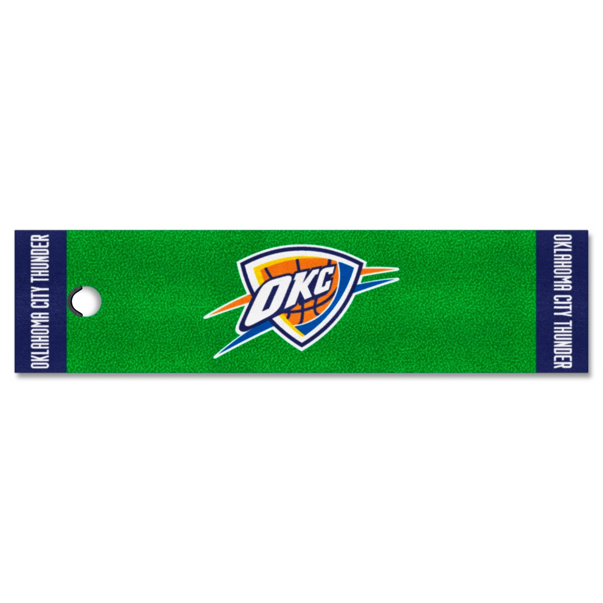 | Oklahoma City Thunder Putting Green Mat - 1.5ft. x 6ft. Realistic putting surface (11* on golf Stimpmeter) Includes putting target barrier/backstop Durable vinyl backing keeps mat in place 100% Nylon Face Doubles as a runner when not in use Officially licensed and chromojet printed in true team colors NBA - Oklahoma City Thunder in Oklahoma NBA National Basketball Association |