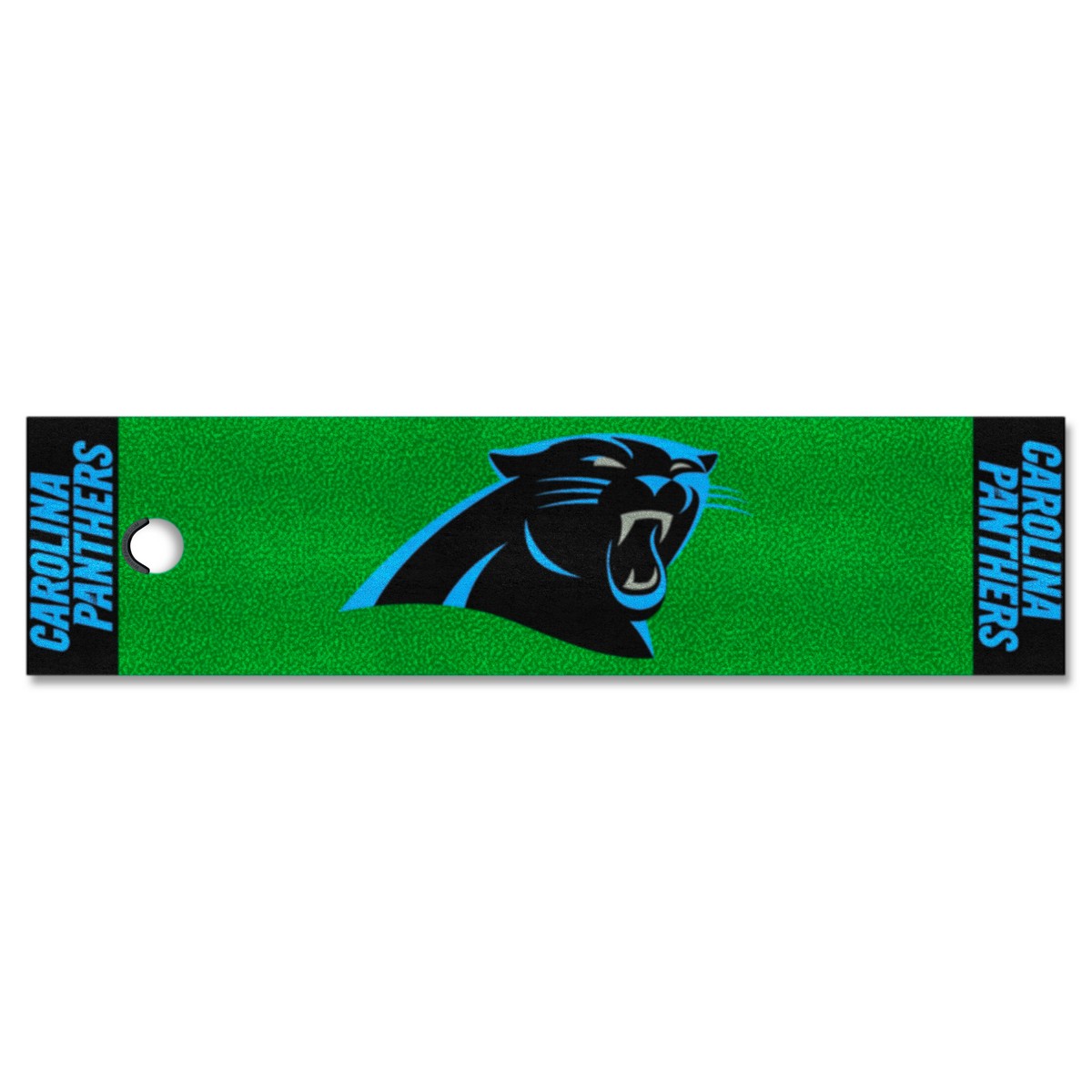 | Carolina Panthers Putting Green Mat - 1.5ft. x 6ft. Realistic putting surface (11* on golf Stimpmeter) Includes putting target barrier/backstop Durable vinyl backing keeps mat in place 100% Nylon Face Doubles as a runner when not in use Officially licensed and chromojet printed in true team colors NFL - Carolina Panthers in North Carolina NFL National Football League |
