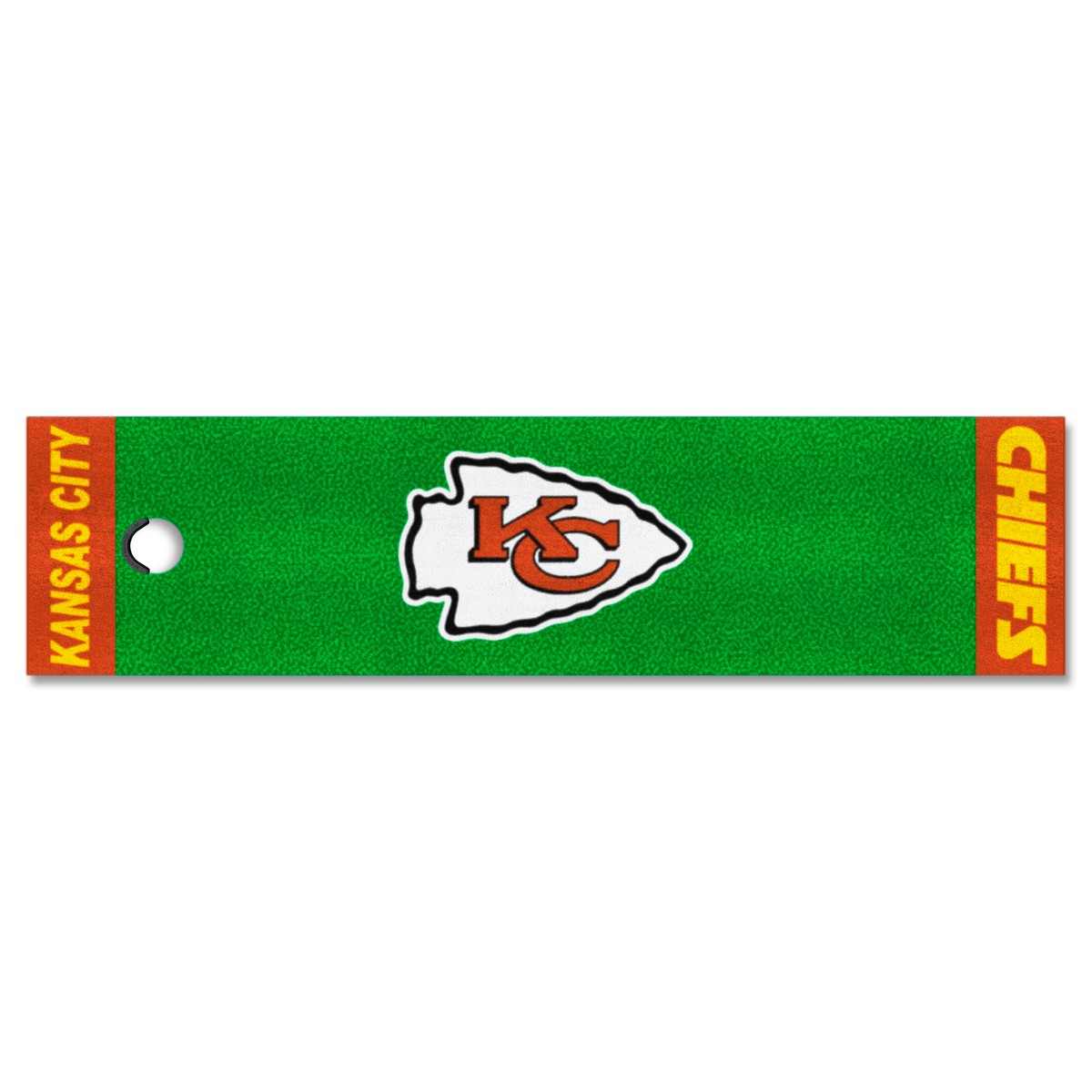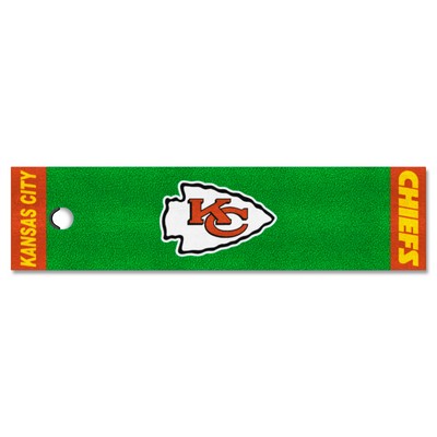 | Kansas City Chiefs Putting Green Mat - 1.5ft. x 6ft. Realistic putting surface (11* on golf Stimpmeter) Includes putting target barrier/backstop Durable vinyl backing keeps mat in place 100% Nylon Face Doubles as a runner when not in use Officially licensed and chromojet printed in true team colors NFL - Kansas City Chiefs in Missouri NFL National Football League |