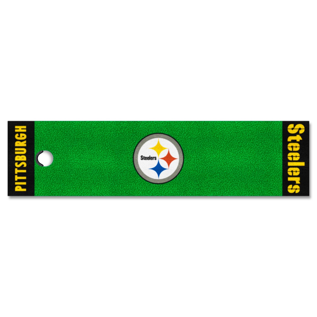 | Pittsburgh Steelers Putting Green Mat - 1.5ft. x 6ft. Realistic putting surface (11* on golf Stimpmeter) Includes putting target barrier/backstop Durable vinyl backing keeps mat in place 100% Nylon Face Doubles as a runner when not in use Officially licensed and chromojet printed in true team colors NFL - Pittsburgh Steelers in Pennsylvania NFL National Football League |