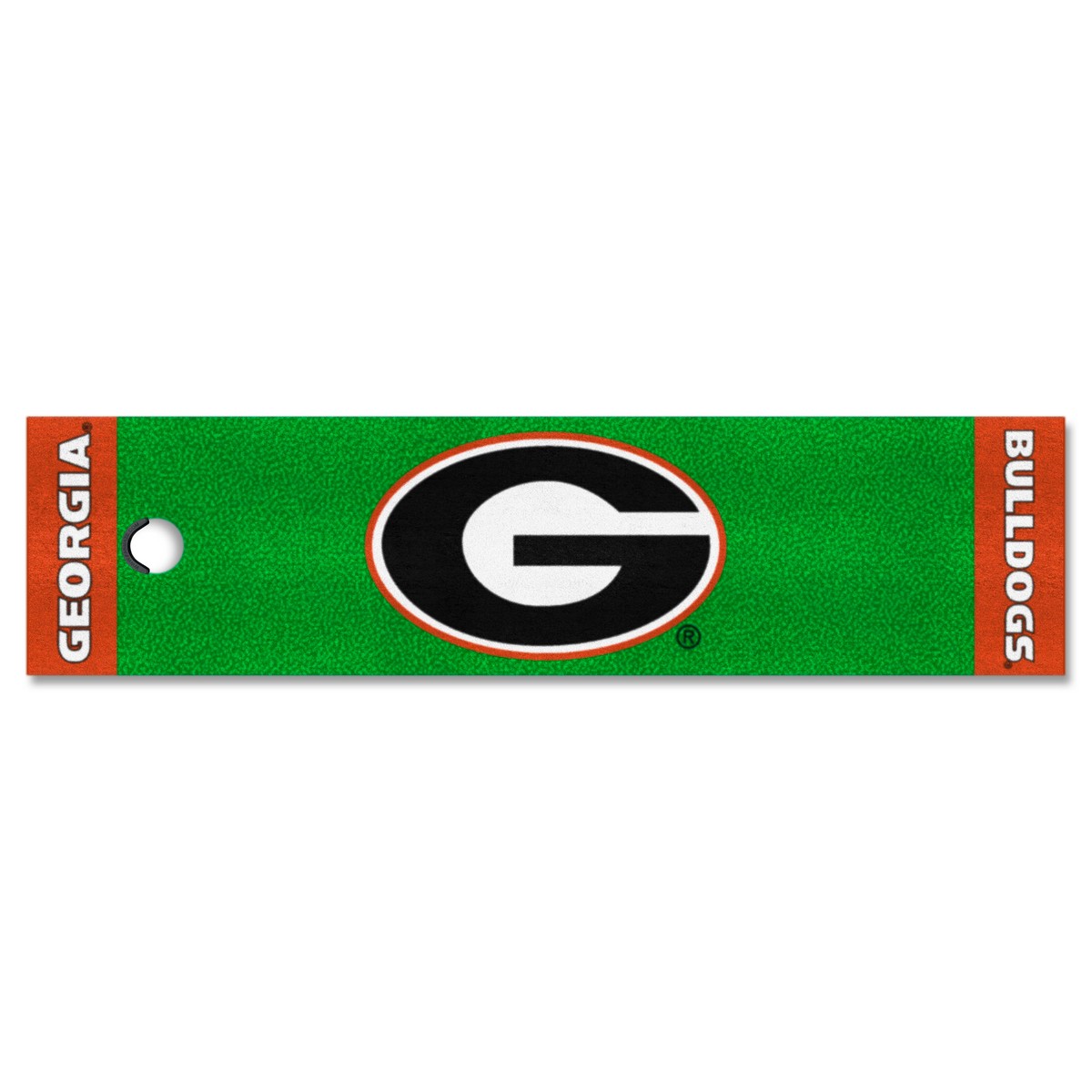 | Georgia Bulldogs Putting Green Mat - 1.5ft. x 6ft. Realistic putting surface (11* on golf Stimpmeter) Includes putting target barrier/backstop Durable vinyl backing keeps mat in place 100% Nylon Face Doubles as a runner when not in use Officially licensed and chromojet printed in true team colors University of Georgia in Georgia |