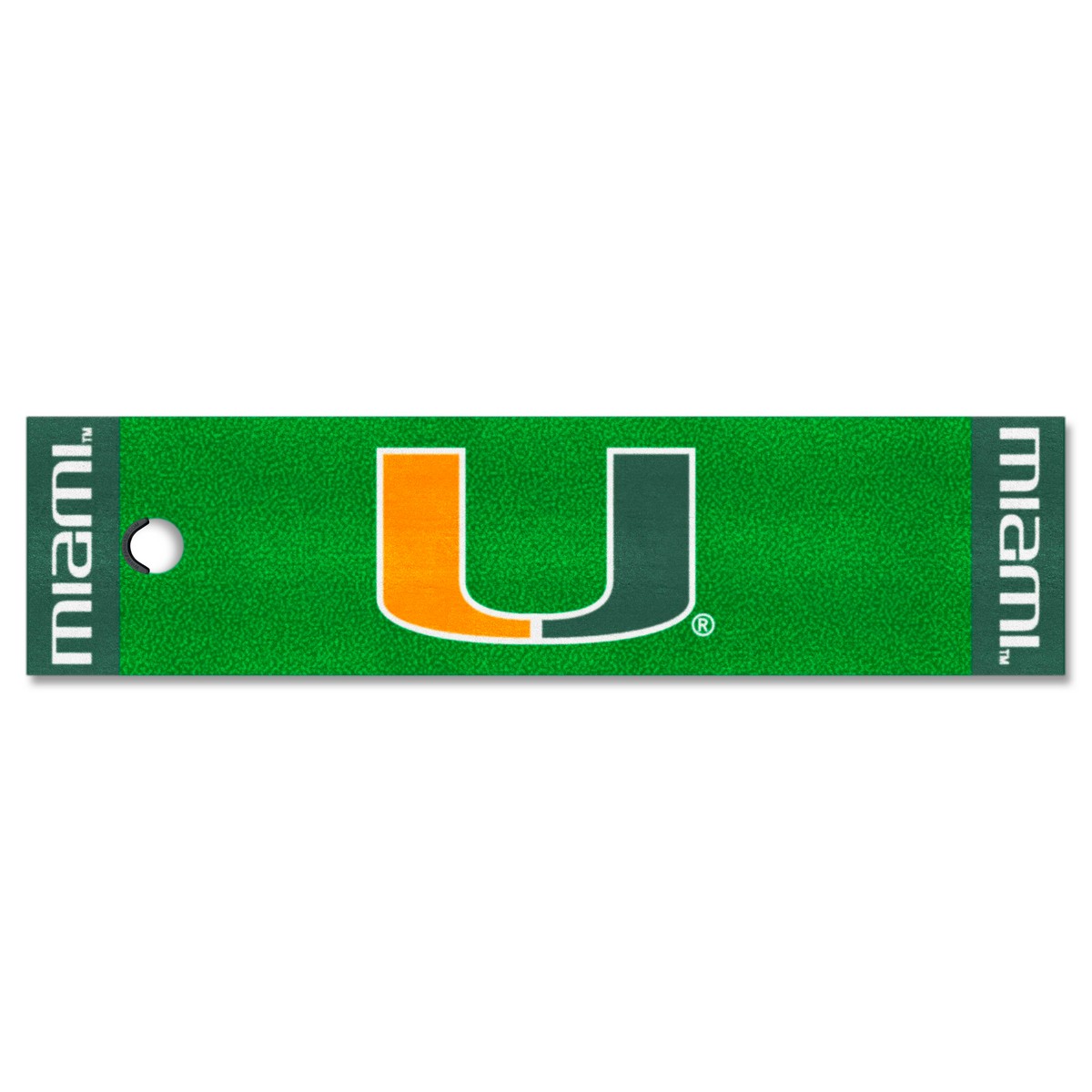| Miami Hurricanes Putting Green Mat - 1.5ft. x 6ft. Realistic putting surface (11* on golf Stimpmeter) Includes putting target barrier/backstop Durable vinyl backing keeps mat in place 100% Nylon Face Doubles as a runner when not in use Officially licensed and chromojet printed in true team colors University of Miami in Florida |