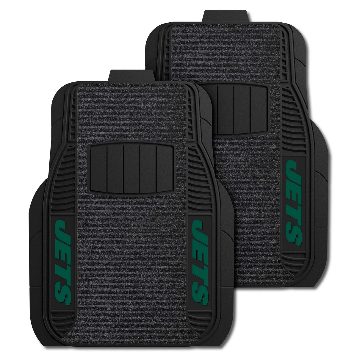 | New York Jets 2 Piece Deluxe Car Mat Set Vinyl & dual ribbed charcoal carpet construction Dirt catching dual ribbed carpet Trimmable edges for a custom fit Nibbed backing keeps mats in place while driving for added safety Molded logos in true team colors Deep pockets catch and hold dirt and water NFL - New York Jets in New Jersey WARNING: This product can expose you to chemicals including, DINP, which is known to the State of California to casue cancer. For more information, go to www.P65Warnings.ca.gov NFL National Football League |