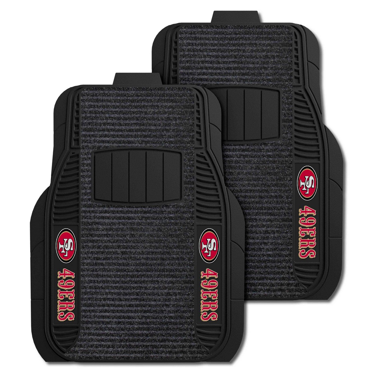 | San Francisco 49ers 2 Piece Deluxe Car Mat Set Vinyl & dual ribbed charcoal carpet construction Dirt catching dual ribbed carpet Trimmable edges for a custom fit Nibbed backing keeps mats in place while driving for added safety Molded logos in true team colors Deep pockets catch and hold dirt and water NFL - San Francisco 49ers in California WARNING: This product can expose you to chemicals including, DINP, which is known to the State of California to casue cancer. For more information, go to www.P65Warnings.ca.gov NFL National Football League |