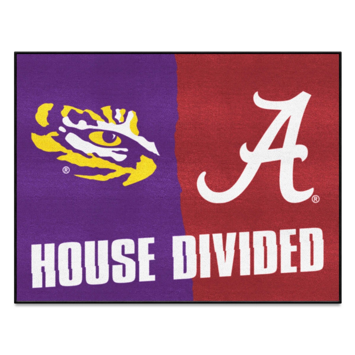 | House Divided - LSU / Alabama House Divided House Divided Rug - 34 in. x 42.5 in. 9 Ounce, 100 % Nylon Face Recycled vinyl backing for a durable and longer-lasting product Machine made and tufted in the USA Non-skid backing with serged borders for added durability Machine washable; vacuum regularly and spot clean for any easy and quick clean Officially licensed and chromojet-printed in true team colors for vibrant, lasting color House Divided - LSU / Alabama in N/A |