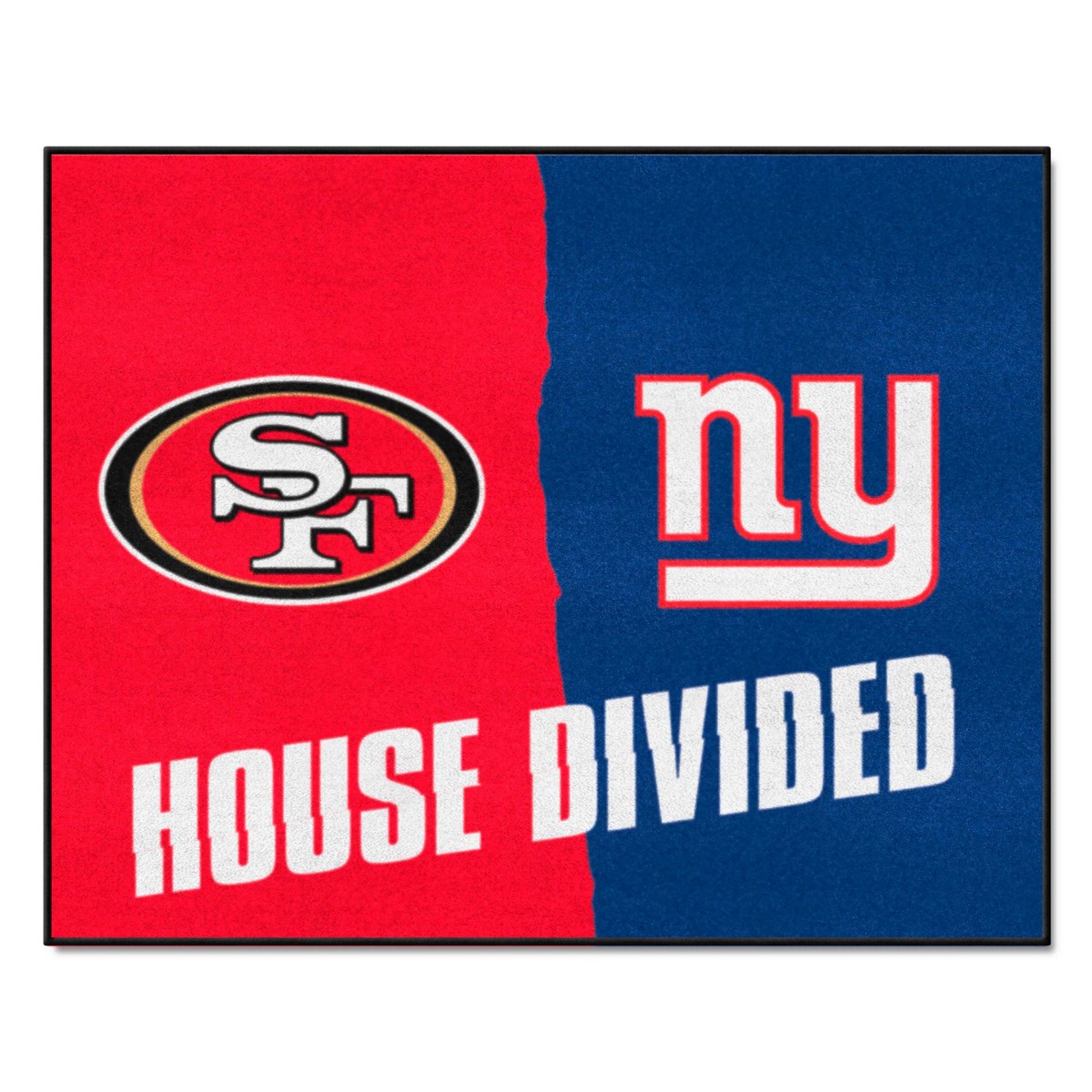 | NFL House Divided - 49ers / Giants House Divided Rug - 34 in. x 42.5 in. 9 Ounce, 100 % Nylon Face Recycled vinyl backing for a durable and longer-lasting product Machine made and tufted in the USA Non-skid backing with serged borders for added durability Machine washable; vacuum regularly and spot clean for any easy and quick clean Officially licensed and chromojet-printed in true team colors for vibrant, lasting color NFL House Divided - 49ers / Giants in N/A NFL National Football League |