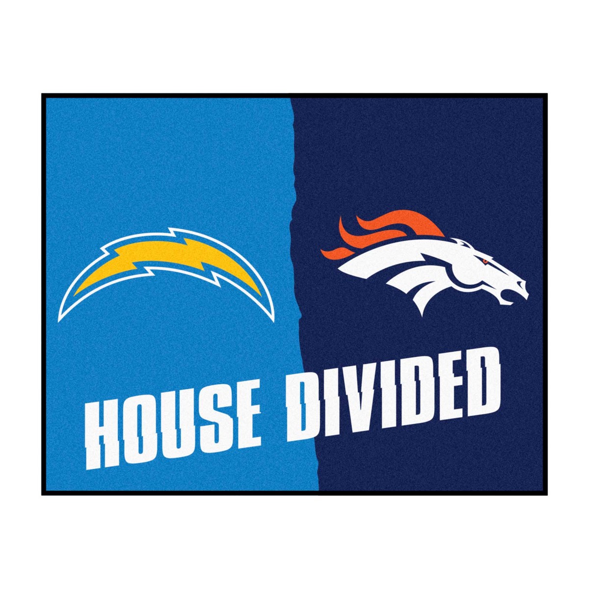 | NFL House Divided - Chargers/ Broncos House Divided Rug - 34 in. x 42.5 in. 9 Ounce, 100 % Nylon Face Recycled vinyl backing for a durable and longer-lasting product Machine made and tufted in the USA Non-skid backing with serged borders for added durability Machine washable; vacuum regularly and spot clean for any easy and quick clean Officially licensed and chromojet-printed in true team colors for vibrant, lasting color NFL House Divided - Chargers / Broncos in N/A NFL National Football League |