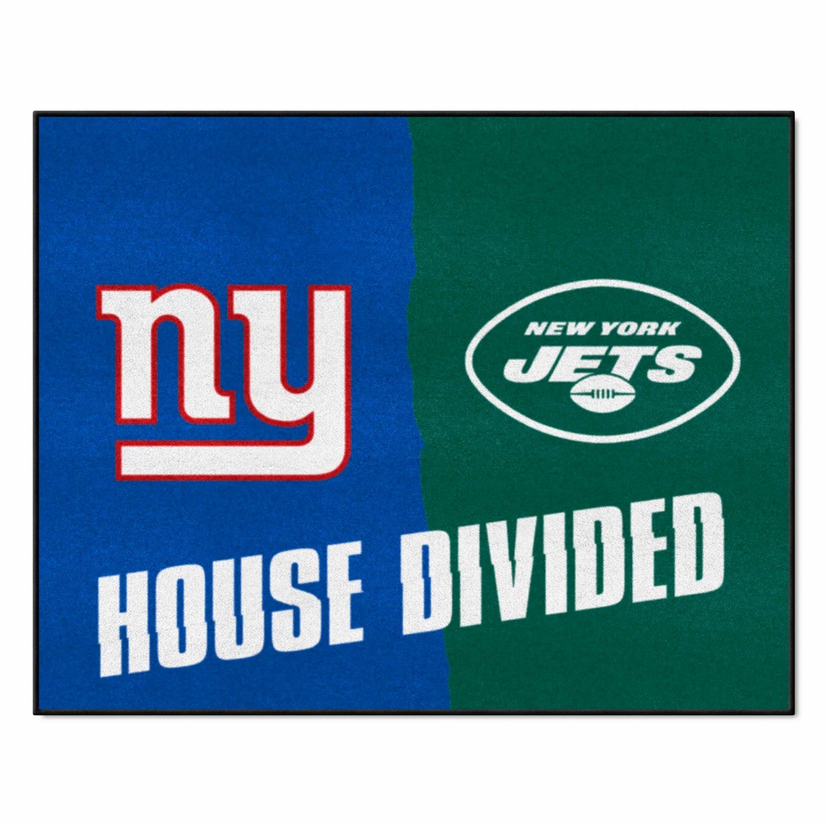 | NFL House Divided - Giants / Jets House Divided Rug - 34 in. x 42.5 in. 9 Ounce, 100 % Nylon Face Recycled vinyl backing for a durable and longer-lasting product Machine made and tufted in the USA Non-skid backing with serged borders for added durability Machine washable; vacuum regularly and spot clean for any easy and quick clean Officially licensed and chromojet-printed in true team colors for vibrant, lasting color NFL House Divided - Giants / Jets in New Jersey NFL National Football League |