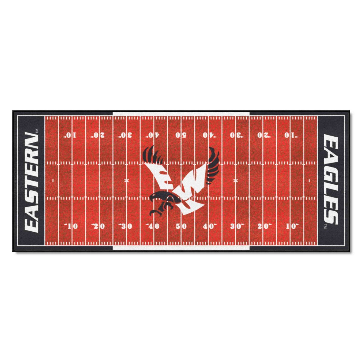 | Eastern Washington Eagles Field Runner Mat - 30in. x 72in. 9 Ounce, 100 % Nylon Face Recycled vinyl backing for a durable and longer-lasting product Machine made and tufted in the USA Non-skid backing with serged borders for added durability Machine washable; vacuum regularly and spot clean for any easy and quick clean Officially licensed and chromojet-printed in true team colors for vibrant, lasting color Eastern Washington University in Washington |