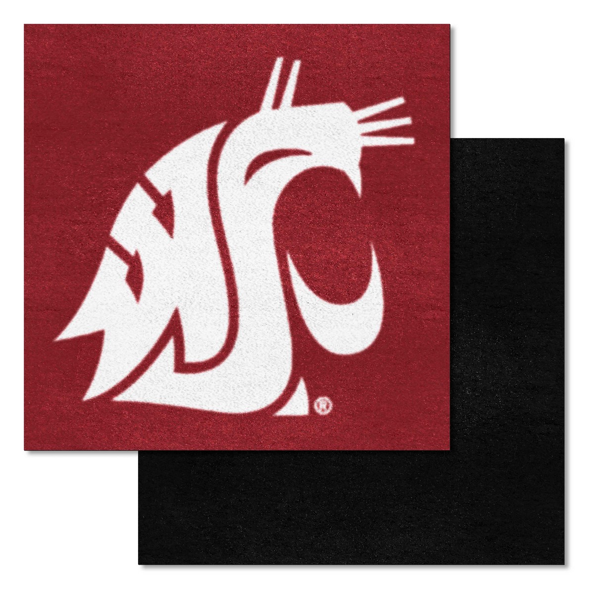| Washington State Cougars Team Carpet Tiles - 45 Sq Ft. Easy to install, adhesive strips included No padding or underlay required 10 team and 10 accent color tiles Smooth recycled backing 9 Ounce, 100 % Nylon Face Covers 45 square feet when assembled Washington State University in Washington |