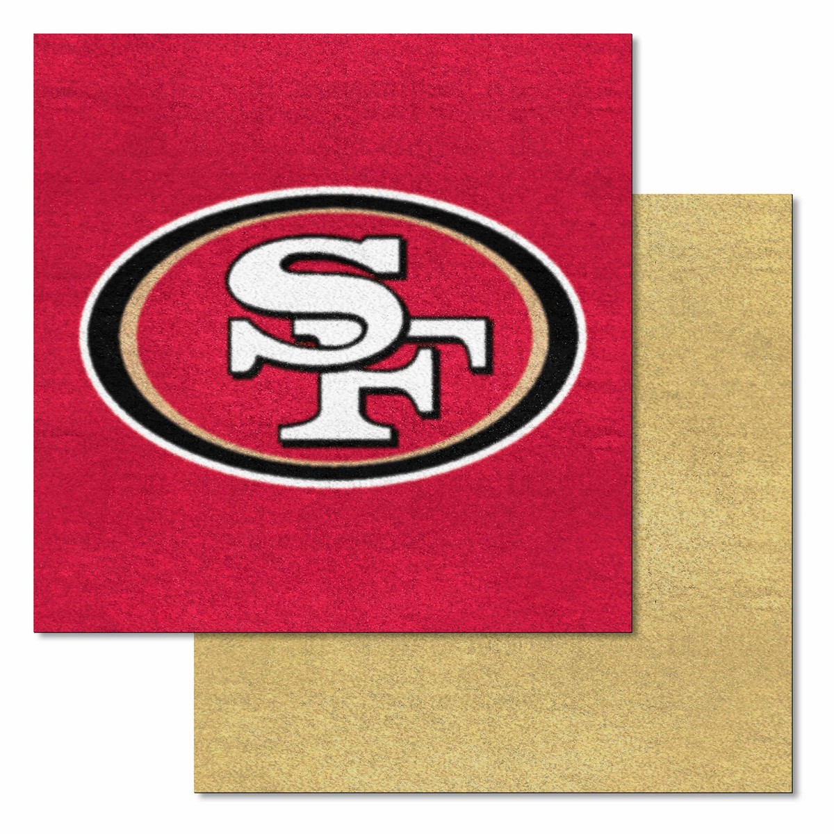 | San Francisco 49ers Team Carpet Tiles - 45 Sq Ft. Easy to install, adhesive strips included No padding or underlay required 10 team and 10 accent color tiles Smooth recycled backing 9 Ounce, 100 % Nylon Face Covers 45 square feet when assembled NFL - San Francisco 49ers in California NFL National Football League |