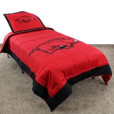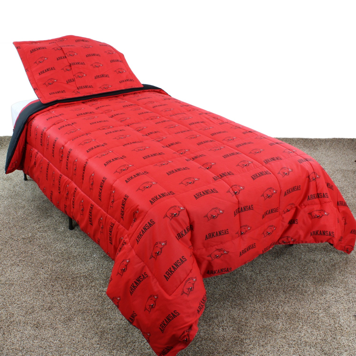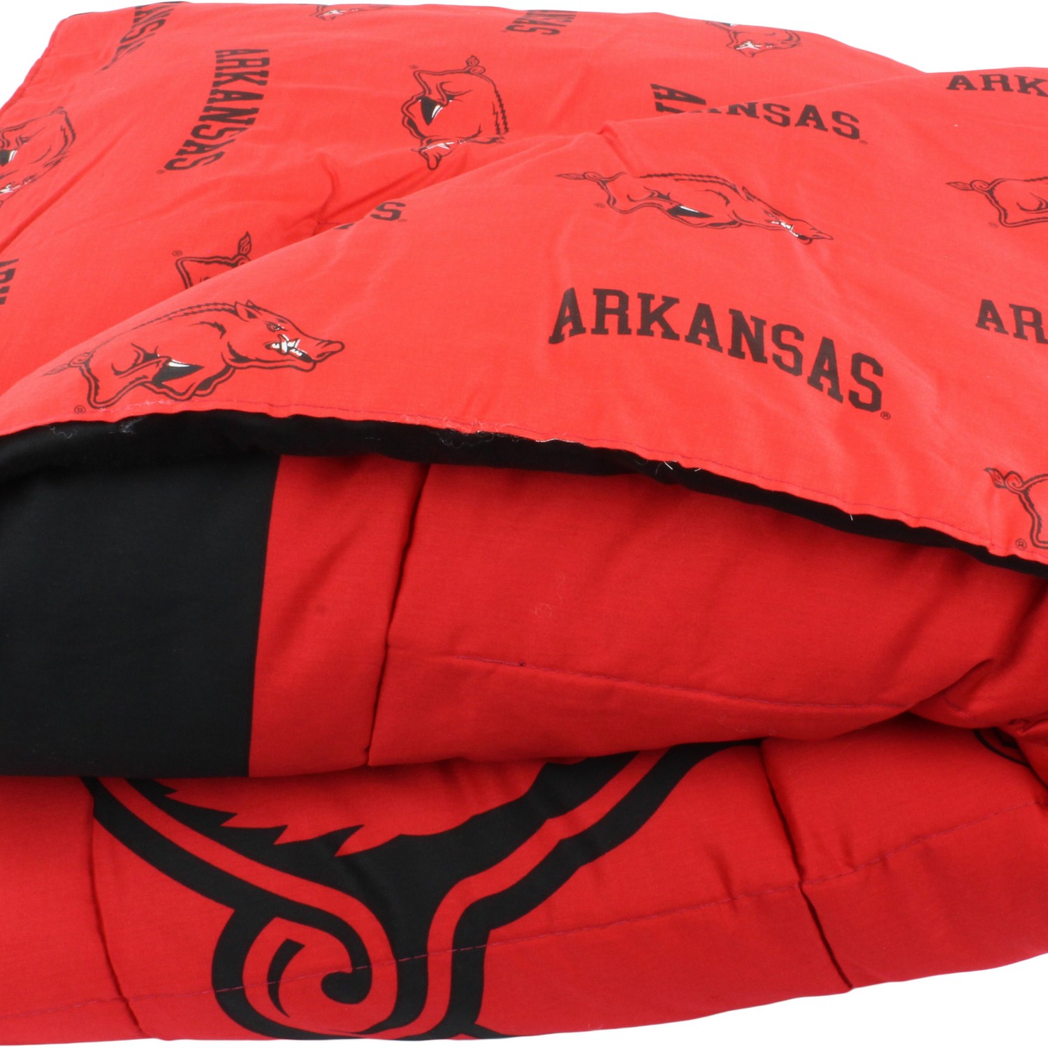 | Arkansas Razorbacks 100% Cotton Sateen, 200 Thread Count. Bright and Vibrant Offically Licensed Colors and Logos Big Logo On The Front Of The Comforter, All Over Print On Back For A Reversible Comforter Comforter Set Includes: 1 Comforter and 2 Pillow Shams Machine Washable In Cold Water, Tumble Dry On Low Heat. Use Commercial Washer and Dryer To Eliminate Chance Of Fabric Rubbing King Comforter Measures: 100" x 96". Imported Machine Wash Cold; Tumble Dry Low |
