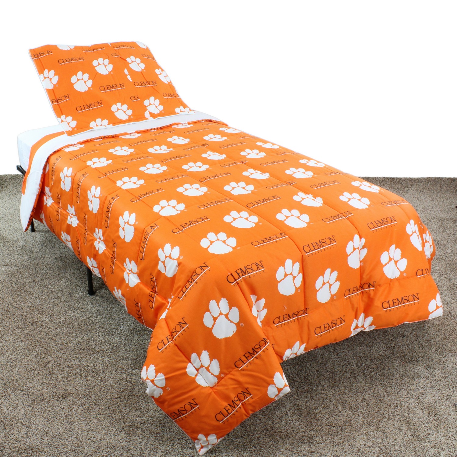 | Clemson Tigers 100% Cotton Sateen, 200 Thread Count. Bright and Vibrant Offically Licensed Colors and Logos Big Logo On The Front Of The Comforter, All Over Print On Back For A Reversible Comforter Comforter Set Includes: 1 Comforter and 2 Pillow Shams Machine Washable In Cold Water, Tumble Dry On Low Heat. Use Commercial Washer and Dryer To Eliminate Chance Of Fabric Rubbing King Comforter Measures: 100" x 96". Imported Machine Wash Cold; Tumble Dry Low |