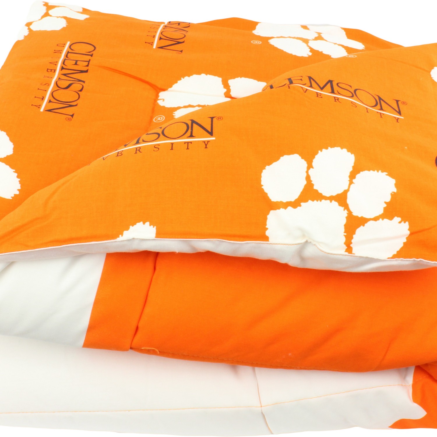 | Clemson Tigers 100% Cotton Sateen, 200 Thread Count. Bright and Vibrant Offically Licensed Colors and Logos Big Logo On The Front Of The Comforter, All Over Print On Back For A Reversible Comforter Comforter Set Includes: 1 Comforter and 2 Pillow Shams Machine Washable In Cold Water, Tumble Dry On Low Heat. Use Commercial Washer and Dryer To Eliminate Chance Of Fabric Rubbing Queen Comforter Measures: 86" x 96". Imported Machine Wash Cold; Tumble Dry Low |
