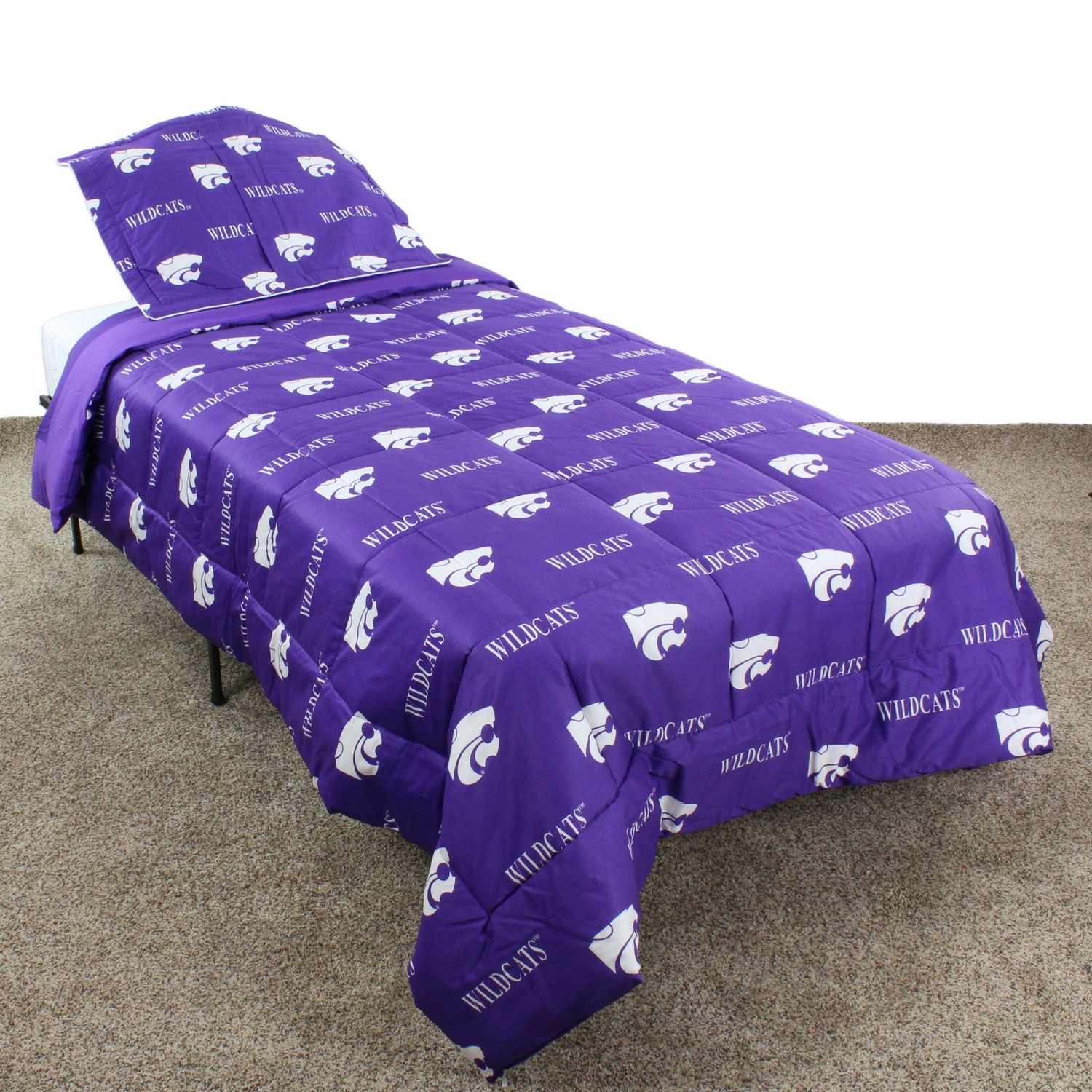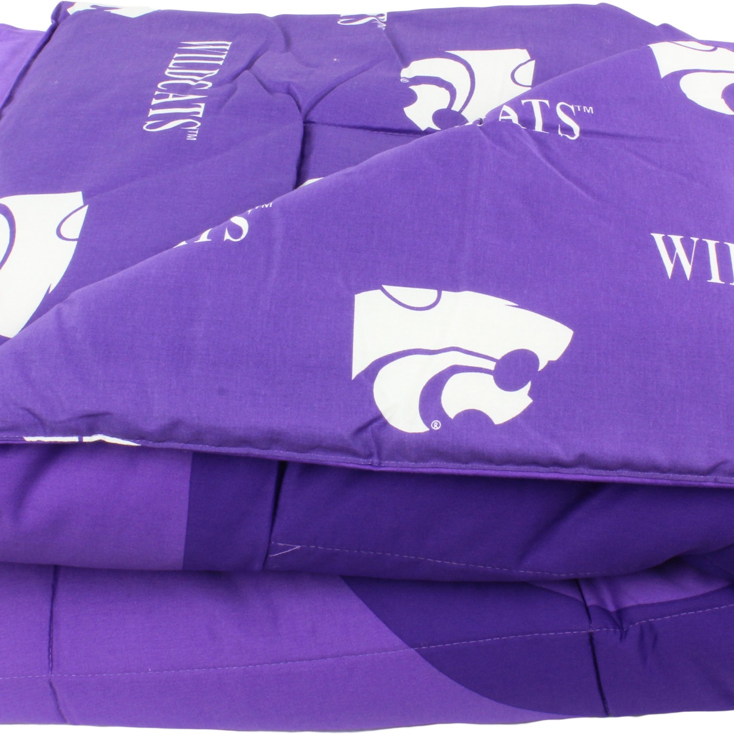 | Kansas State Wildcats 100% Cotton Sateen, 200 Thread Count. Bright and Vibrant Offically Licensed Colors and Logos Big Logo On The Front Of The Comforter, All Over Print On Back For A Reversible Comforter Comforter Set Includes: 1 Comforter and 1 Pillow Sham Machine Washable In Cold Water, Tumble Dry On Low Heat. Use Commercial Washer and Dryer To Eliminate Chance Of Fabric Rubbing Twin Comforter Measures: 68" x 86". Imported Machine Wash Cold; Tumble Dry Low |